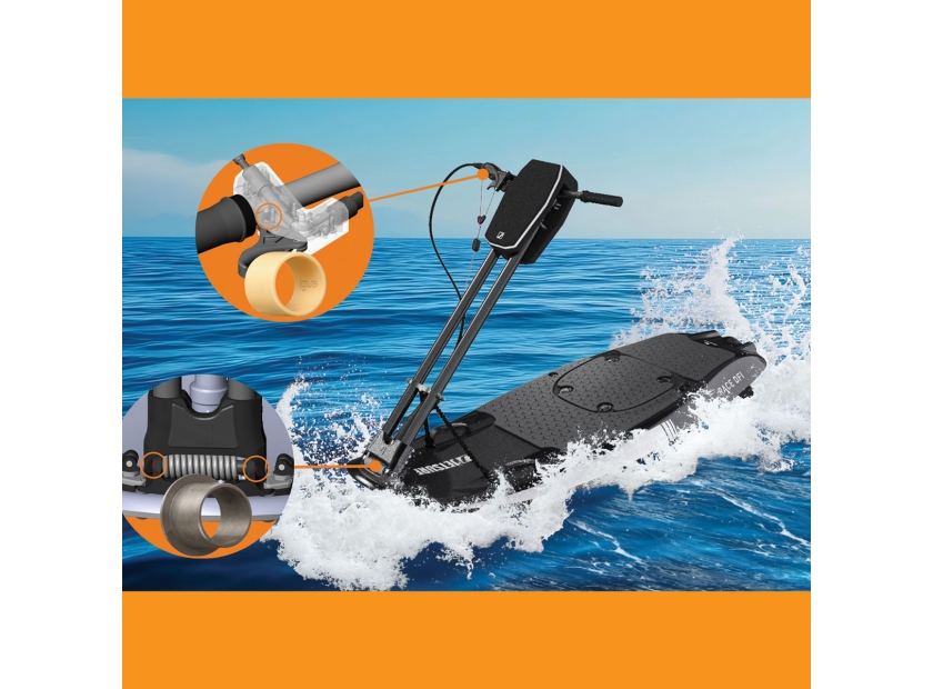 Rushing across the water on a motorised surfboard: the Jetsurf combines the thrill of jet-skiing with the feel of a motorbike. The engineers at Czech manufacturer MSR Engines rely on igus plain bearings made of high-performance plastic to ensure that the fun in salt water is not spoilt by technical failure.